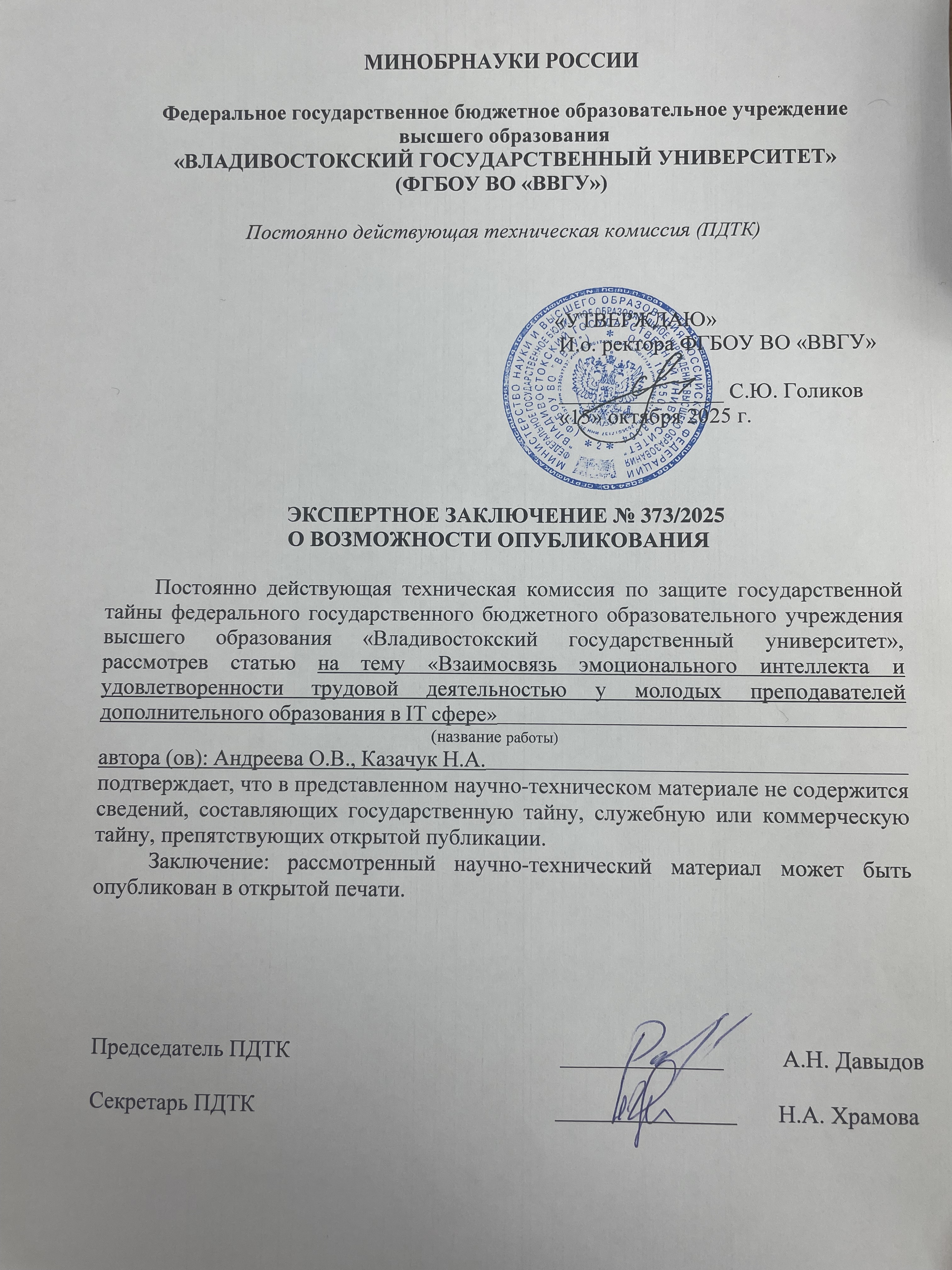 Взаимосвязь эмоционального интеллекта и удовлетворённости трудовой деятельностью у молодых преподавателей дополнительного образования в IT сфере